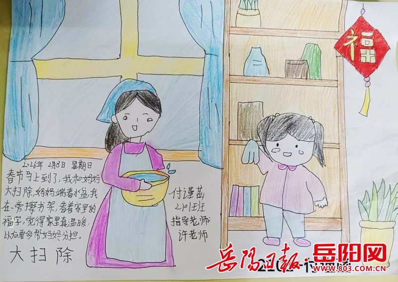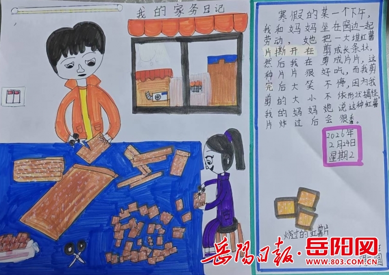 岳阳日报2月28日讯(通讯员 刘伟伟)为深入推动美育浸润行动,丰富学生寒假生活,岳阳县荷花塘小学精心组织开展了“我的家务日记”寒假实践活动,以富有创意的方式将美育融入日常劳动,取得良好育人成效。