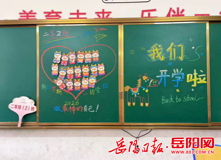 开学前,学校召开行政与全体教职工会议,明确教学安排、安全职责与服务要求。安全工作领导小组对教学楼、食堂、操场、消防设施、水电线路等重点区域开展拉网式排查,及时整改维修,筑牢校园安全屏障。同时,各班级精心布置教室环境,二年级2班“我们开学啦”主题板报格外醒目:心形图案里贴满可爱的卡通红包,“新的学期,一切皆甜”“2026,做最棒的自己”的寄语充满暖意,黑板旁的彩绘小马更是寓意着“马”力全开、逐梦前行的新学期愿景,为校园增添了浓浓的开学仪式感。