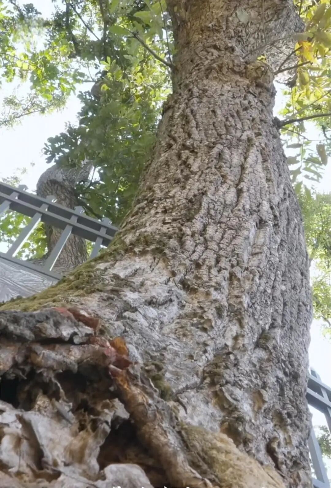 历经千年,九根分支如今仅剩一根,且树头内部早已中空,但依旧参天而立,枝繁叶茂,需五名成年男子手拉手才能合抱,树干上满是皱纹一样的树皮,沟壑清晰可见。