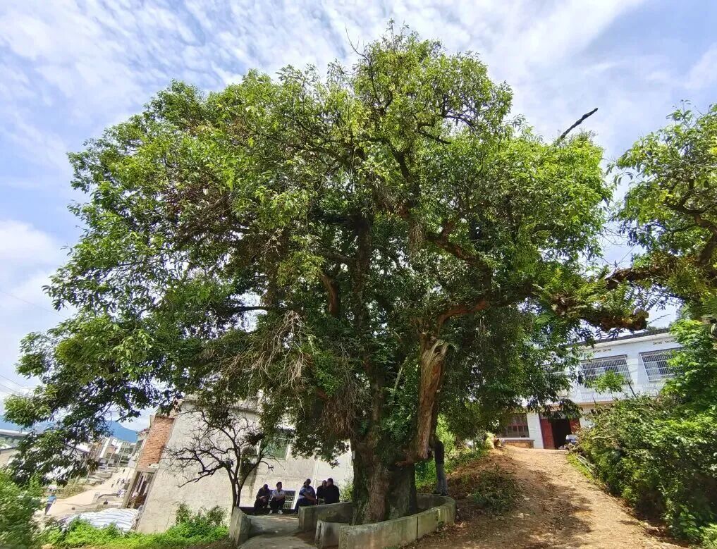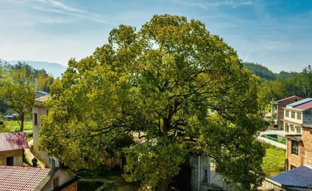 苦槠树高近20米,胸围9米,冠幅东西十多米。1984年,这株树遭遇特大风暴,满树枝干散落一地,只剩孤零零的树桩。村民们以为它死了,没想到第二年,树桩上竟长出新枝,如今再次枝繁叶茂。