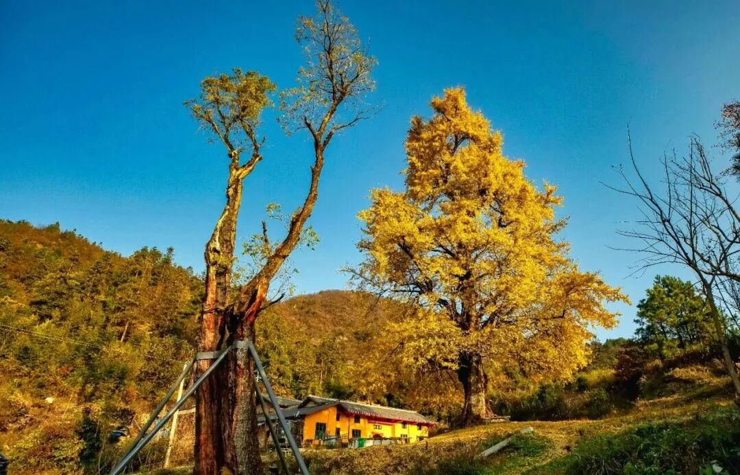 一棵是银杏,一棵是槐树。当地村民敬称它们为“槐相公”和“杏小姐”。传说是唐中宗年间庵中仙姑所栽,寄托了出家人对人世间美好的祝愿,距今1300多年。两树胸径分别为1.8米和1.64米,树高均在30米左右,枝叶相偎,根系紧握。