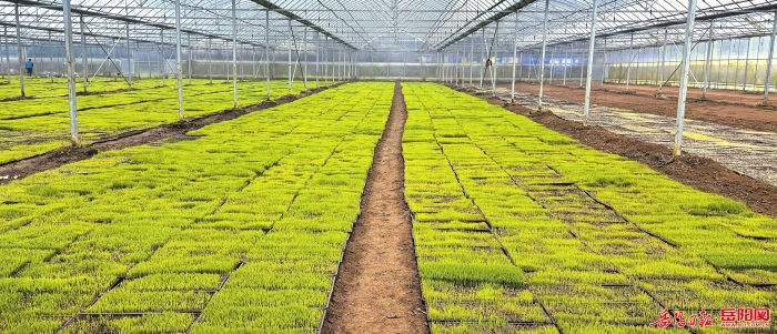▲华容县回龙水稻种植合作社育秧大棚内绿意盎然。周颖摄