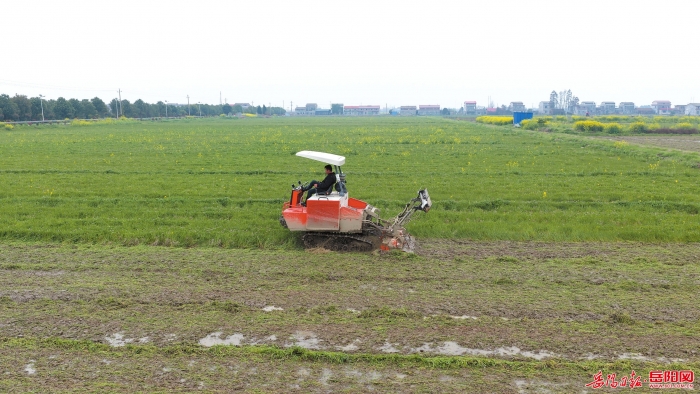 ▲湘阴鹤龙湖镇千亩绿肥示范片内,旋耕机来回穿梭,将盛花期的紫云英翻压入土,原本板结的田块变得平整松软。黄家睿摄