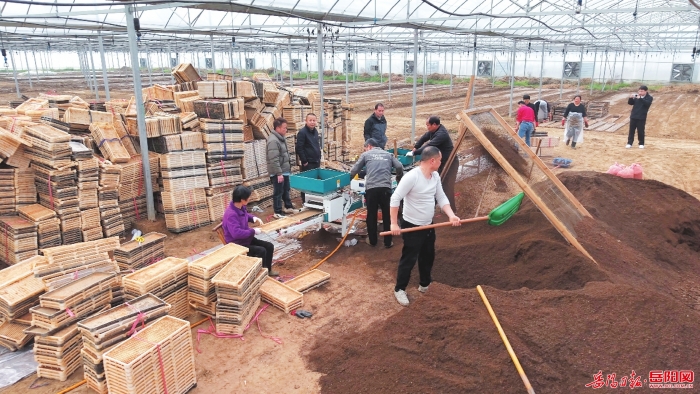 ▲汨罗市罗江镇专业育秧中心智能化大棚内,种植户进行装土摆盘作业。胡清摄