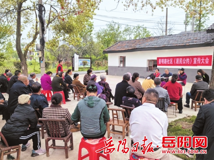 君山区柳林洲街道景明路社区新时代文明实践站在村文化活动广场召开居民公约宣传大会。