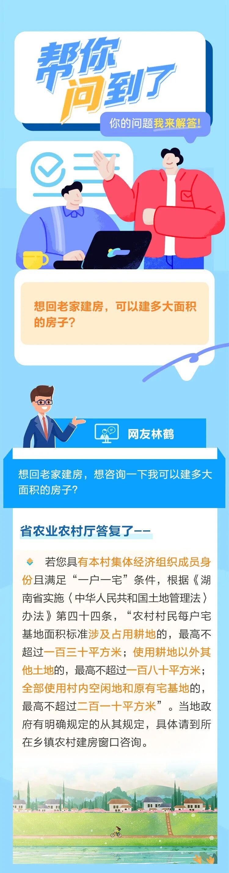 近日,有网友在湖南省人民政府门户网站留言咨询,想回老家建房,可以建多大面积的房子?湖南省农业农村厅对此进行了答复。