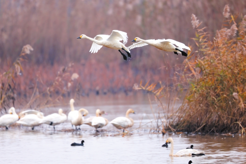 清晨,成群小天鹅在东古湖湿地觅食栖息。周洋摄