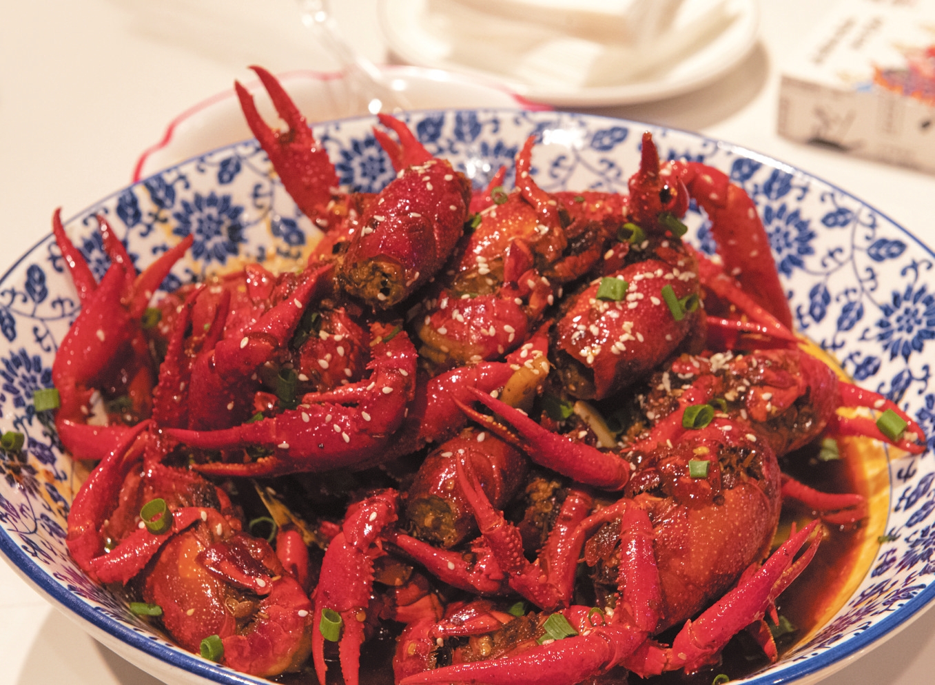 撒上芝麻的小龙虾被端上桌,虾肉鲜嫩弹牙。