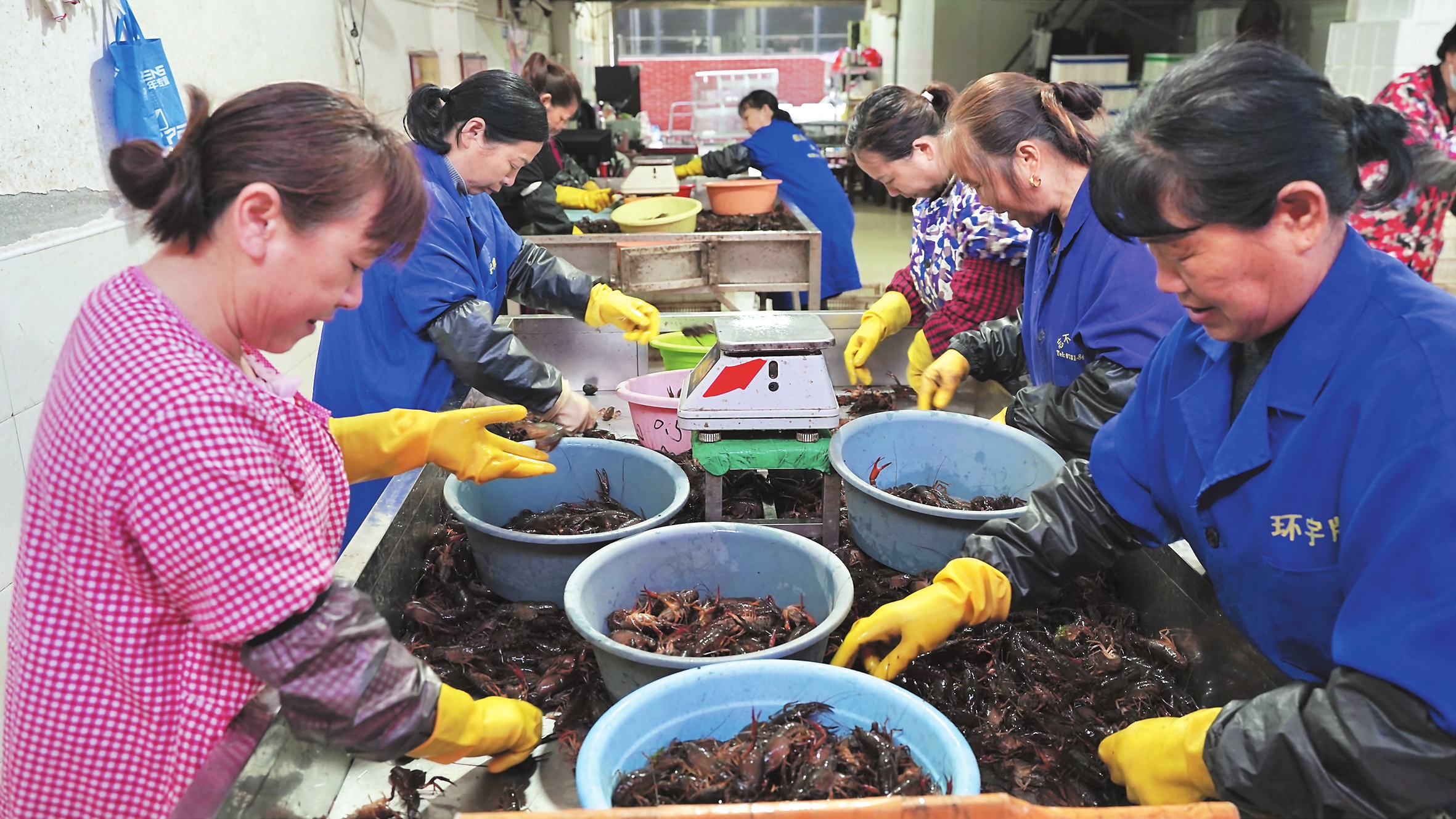 分拣工人正按规格大小分拣龙虾。