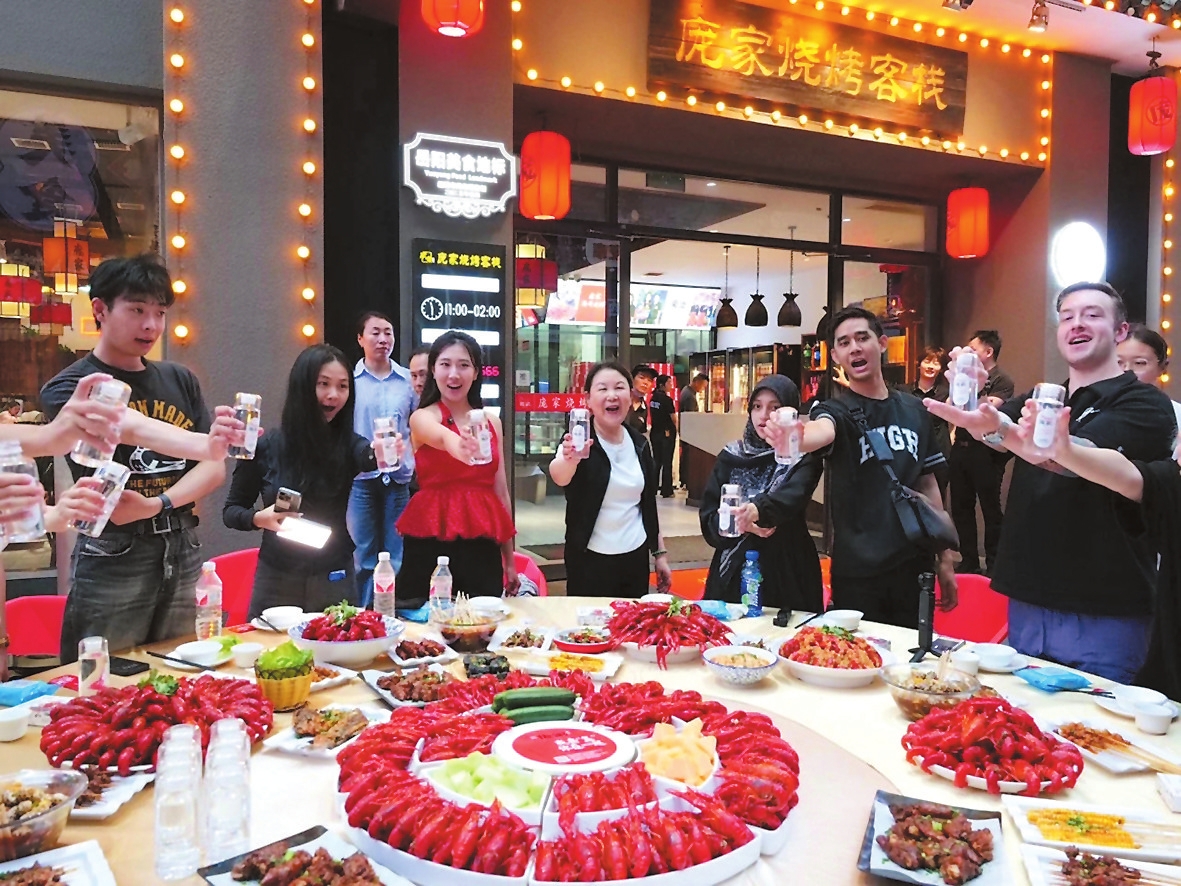 外国友人初到岳阳,品尝美味的小龙虾。