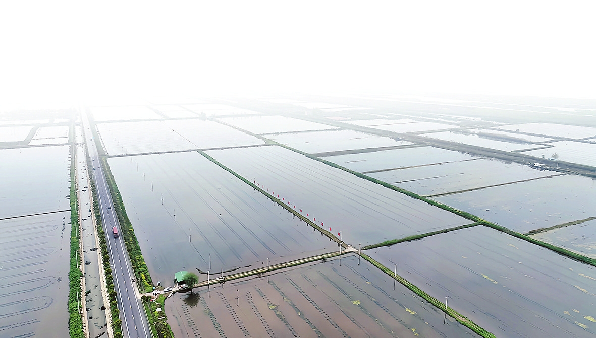 鸟瞰君山区万亩稻虾综合种养示范基地。