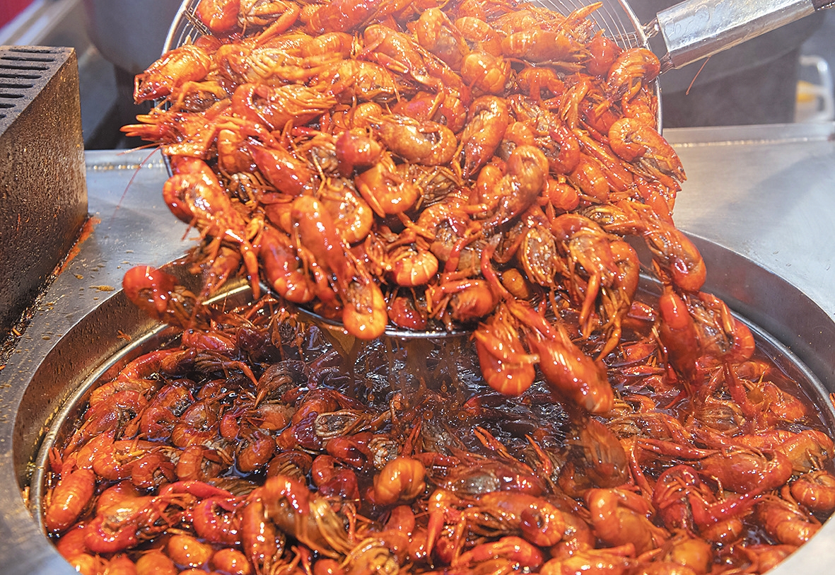 夜宵店热销的卤虾正等待出锅。