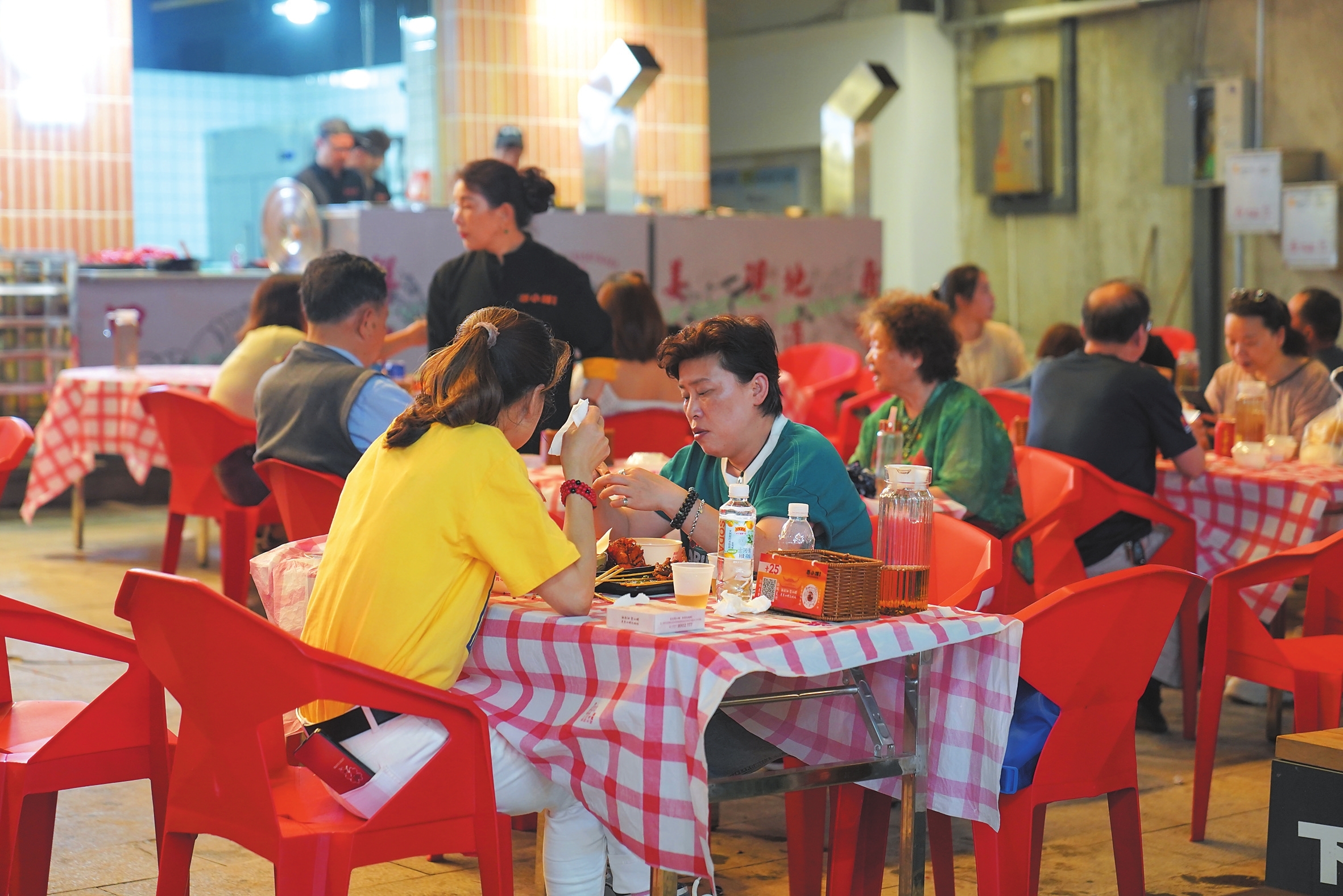 夜宵店门口,食客们围坐小桌,烟火气十足。